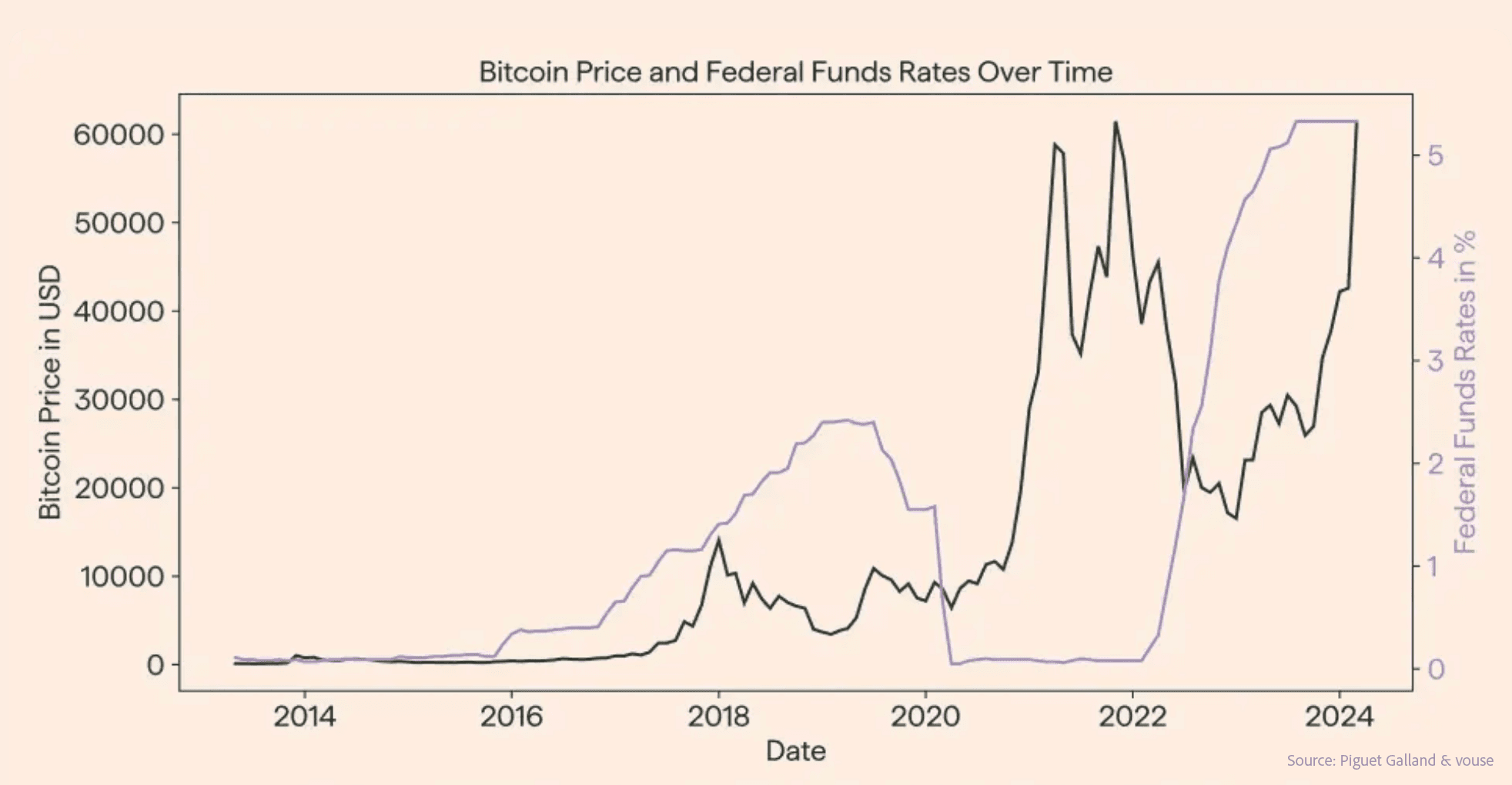 The correlation between Fed rates and Bitcoin isn't entirely clear, but it is worth noting that Bitcoin’s breakout in 2020 didn’t occur until after rates took a sharp turn south.
